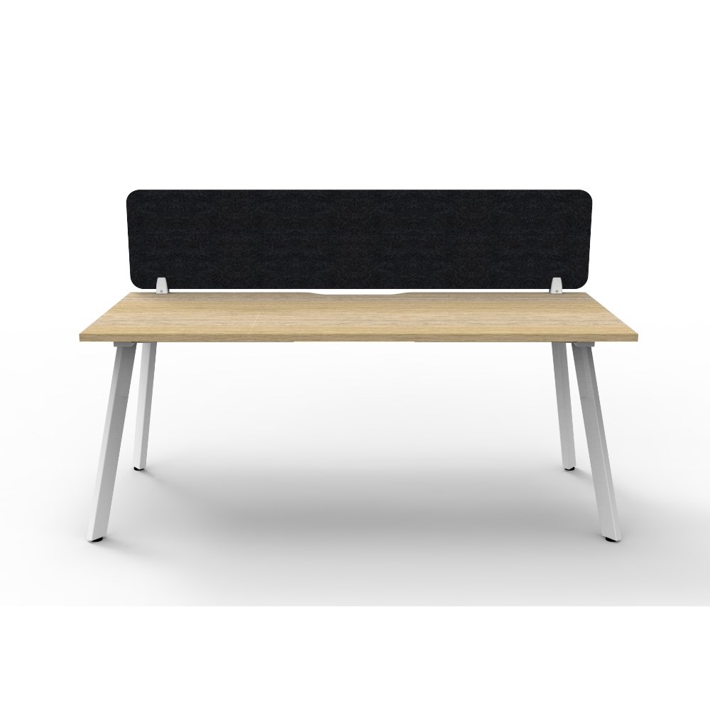 • Natural Oak worksurface with rigid edging and 410mmW x 50mmD scallop cable access. White Satin powder coat frame. Eco screen.