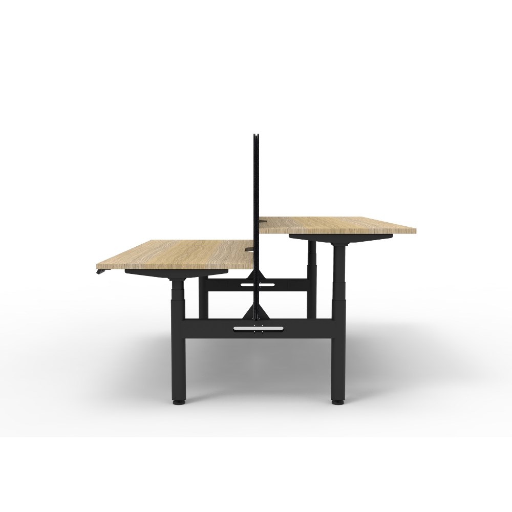 • Electric height adjustable 2 person back to back workstation with Natural Oak top and Black Satin frame, Black Eco screen.