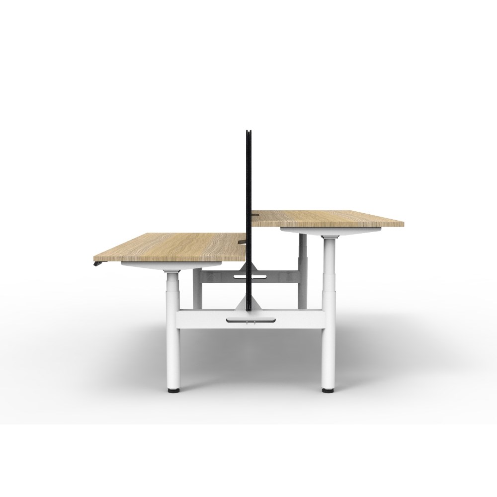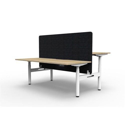 • Electric height adjustable 2 person back to back workstation with Natural Oak top and White Satin frame, Black Eco screen.