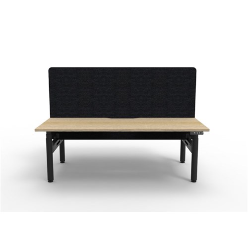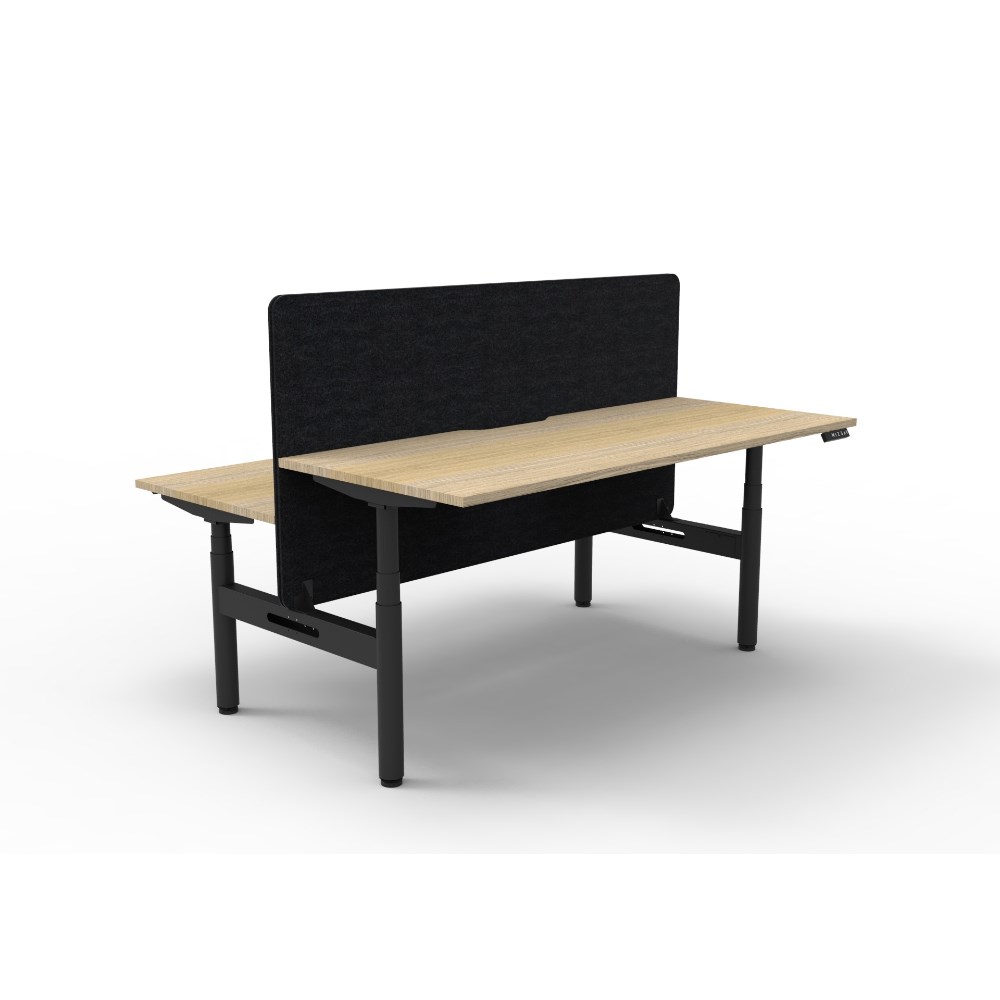 • Electric height adjustable 2 person back to back workstation with Natural Oak top and Black Satin frame, Black Eco screen.