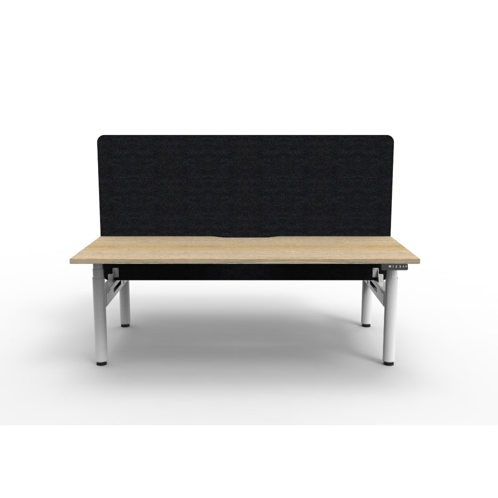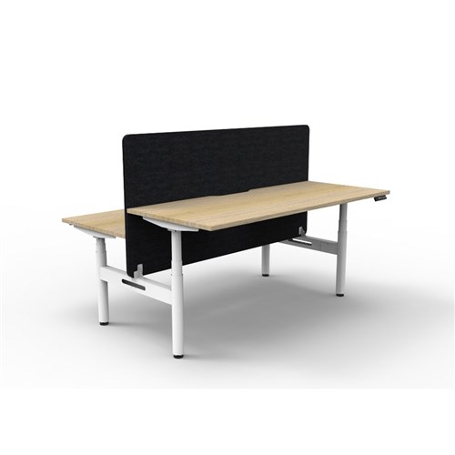 • Electric height adjustable 2 person back to back workstation with Natural Oak top and White Satin frame, Black Eco screen.