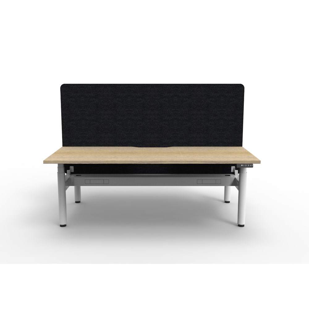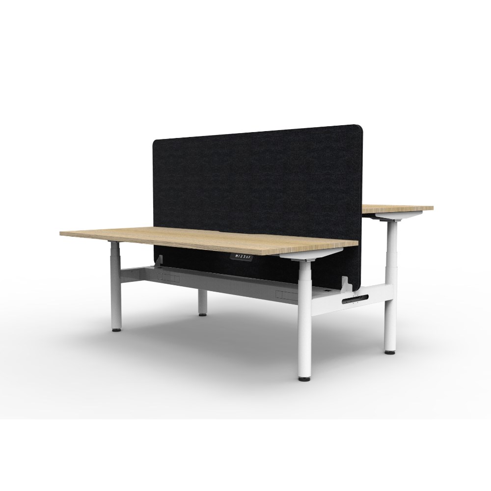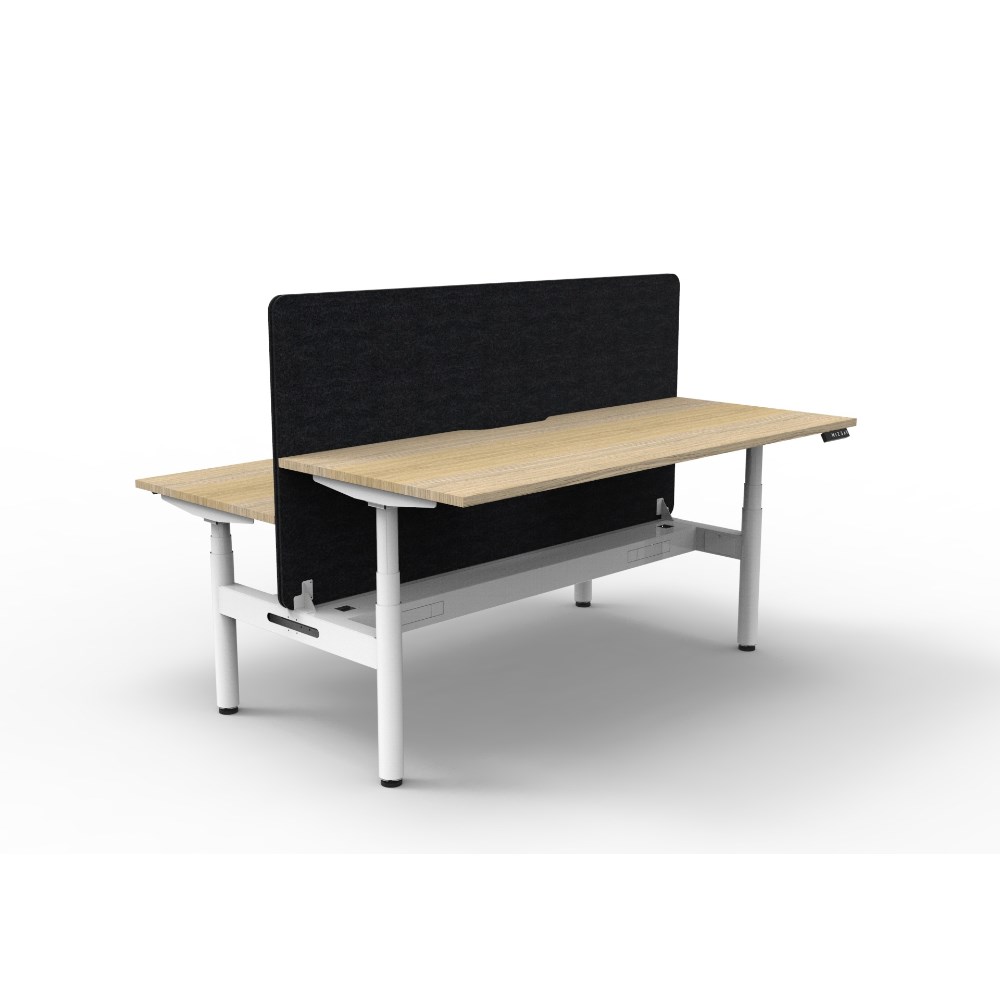• Electric height adjustable 2 person back to back workstation with Natural Oak top and White Satin frame, Black Eco screen and cable tray.