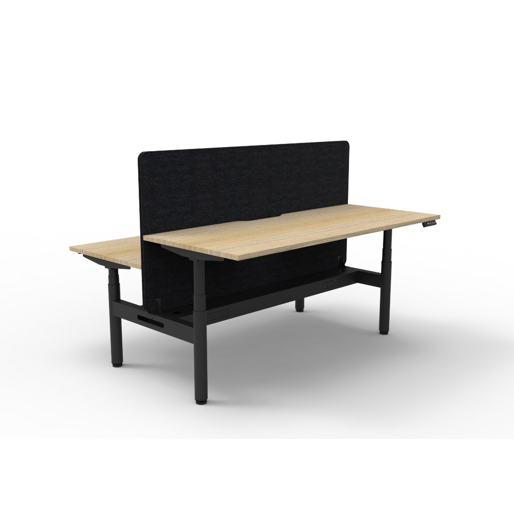 • Electric height adjustable 2 person back to back workstation with Natural Oak top and Black Satin frame, Black Eco screen and cable tray.