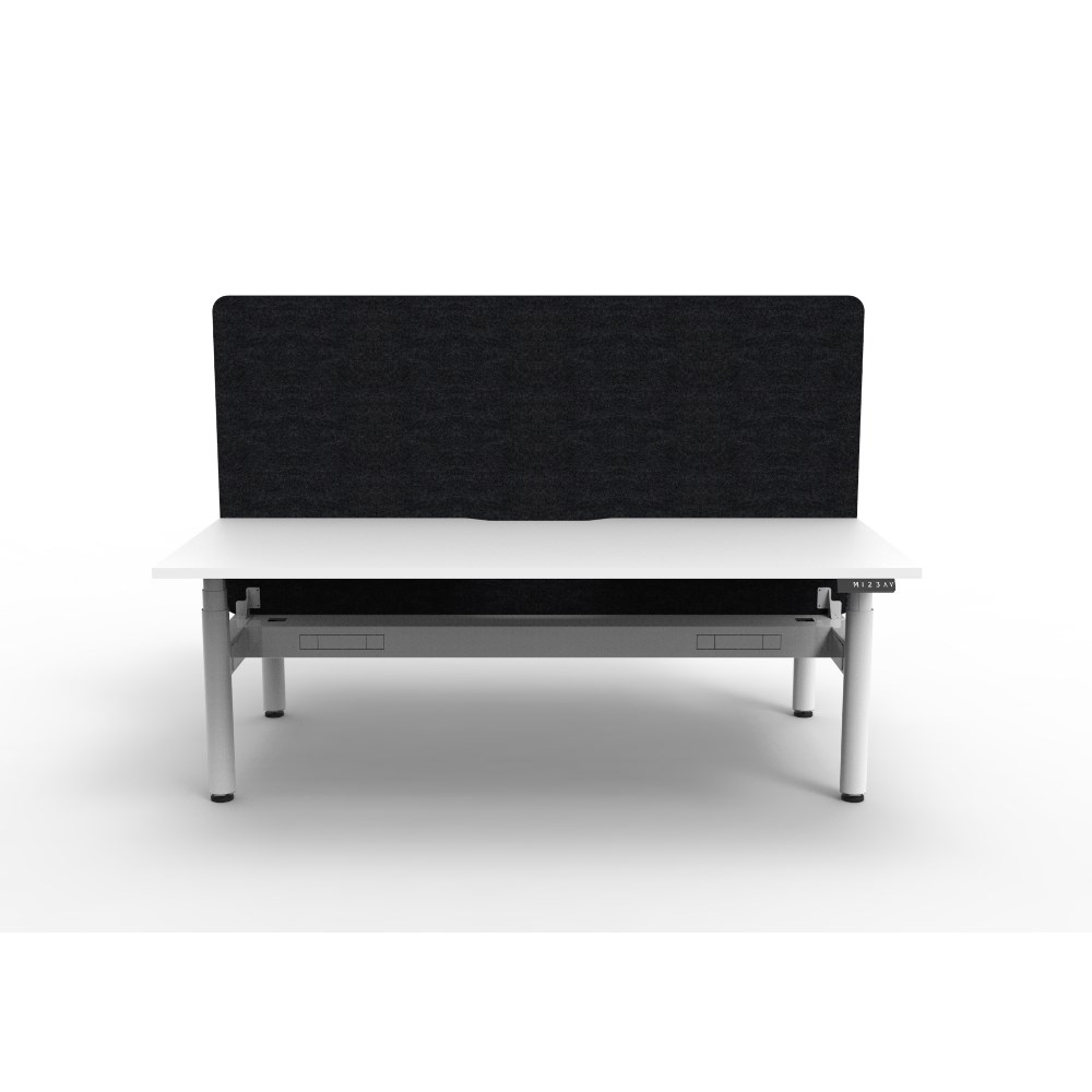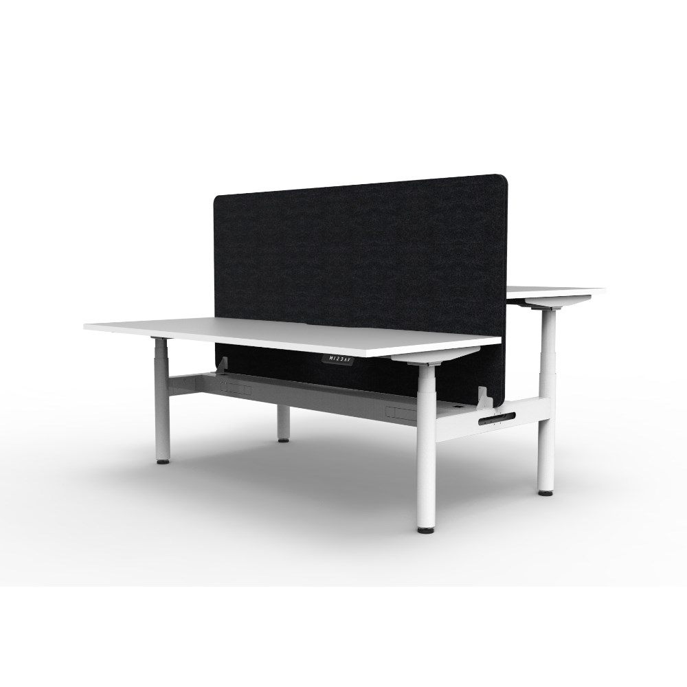 • Electric height adjustable 2 person back to back workstation with White top and White Satin frame, Black Eco screen and cable tray.