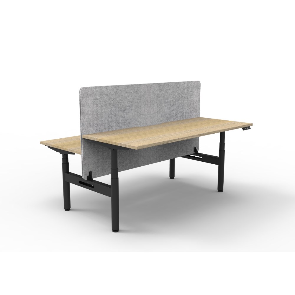• Electric height adjustable 2 person back to back workstation with Natural Oak top and Black Satin frame, Grey Eco screen.