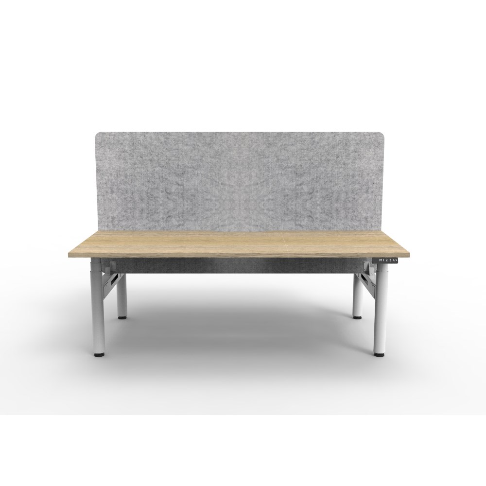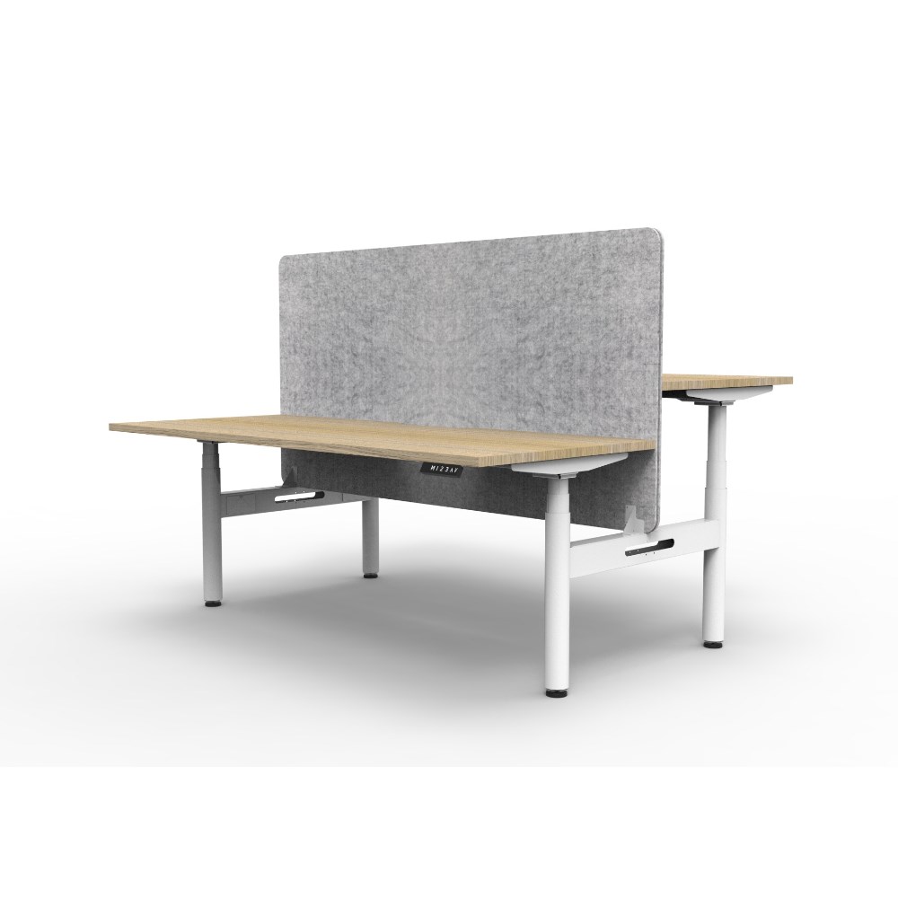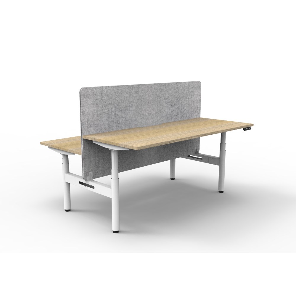 • Electric height adjustable 2 person back to back workstation with Natural Oak top and White Satin frame, Grey Eco screen.