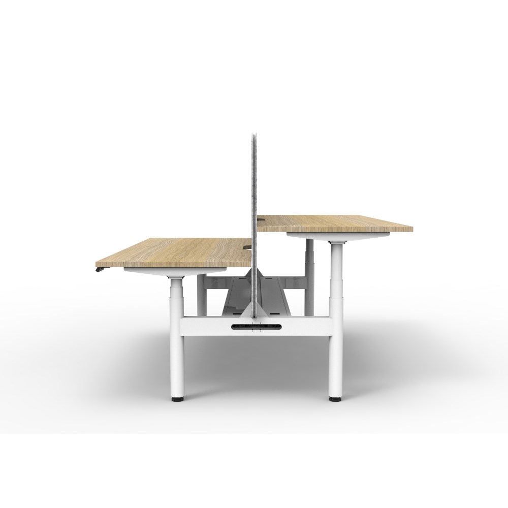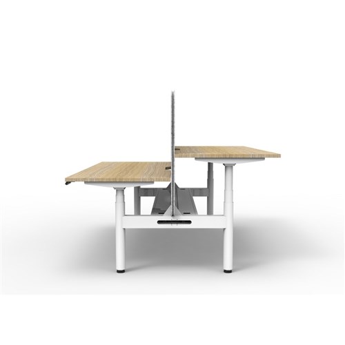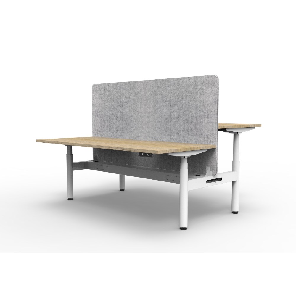 • Electric height adjustable 2 person back to back workstation with Natural Oak top and White Satin frame, Grey Eco screen and cable tray.