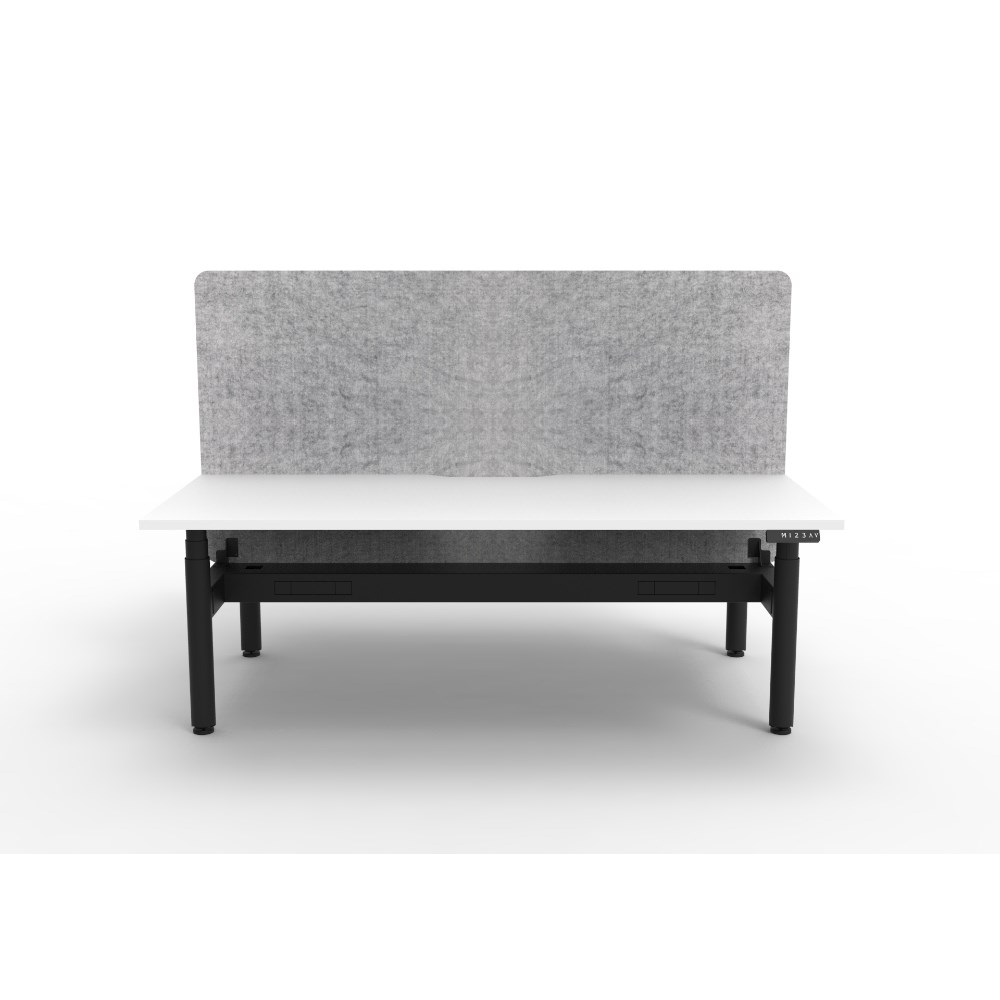 • Electric height adjustable 2 person back to back workstation with White top and Black Satin frame, Grey Eco screen and cable tray.
