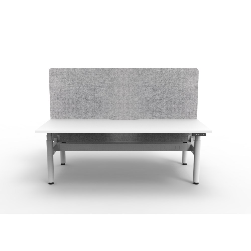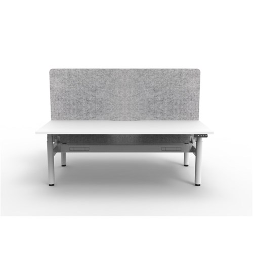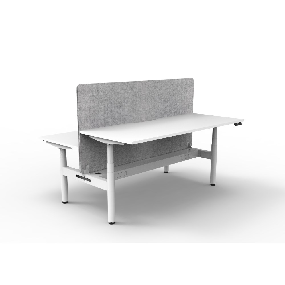 • Electric height adjustable 2 person back to back workstation with White top and White Satin frame, Grey Eco screen and cable tray.
