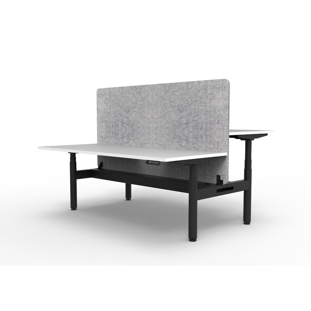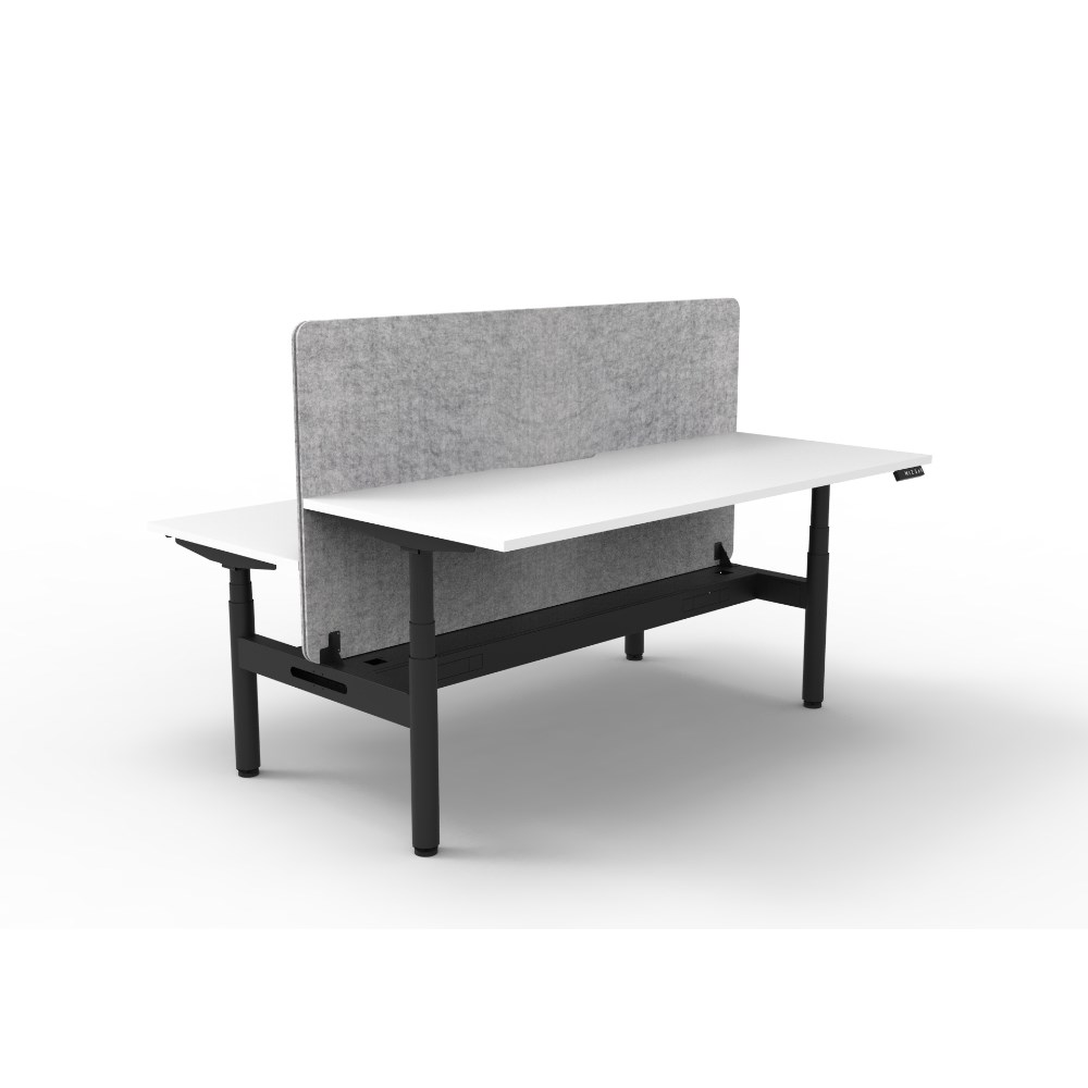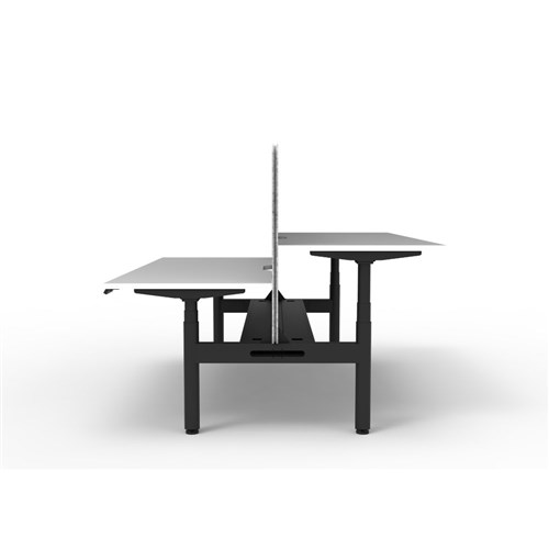 • Electric height adjustable 2 person back to back workstation with White top and Black Satin frame, Grey Eco screen and cable tray.
