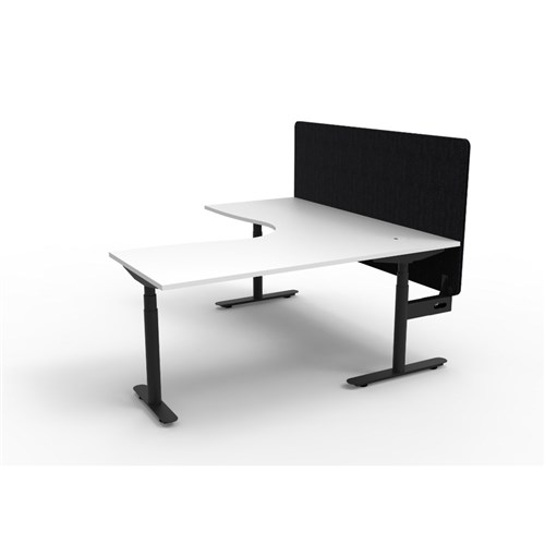 • Electric height adjustable corner workstation with White top and Black Satin frame, Black Eco screen.