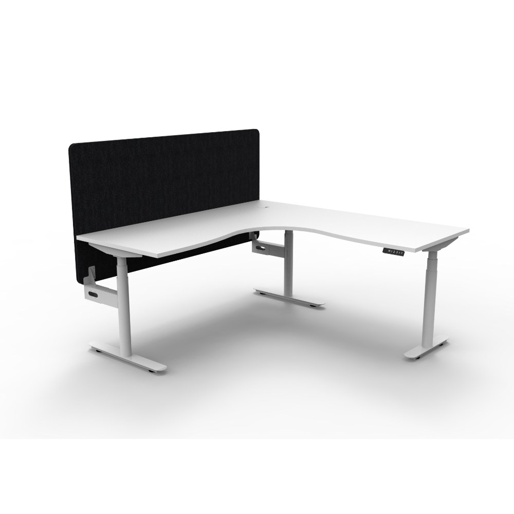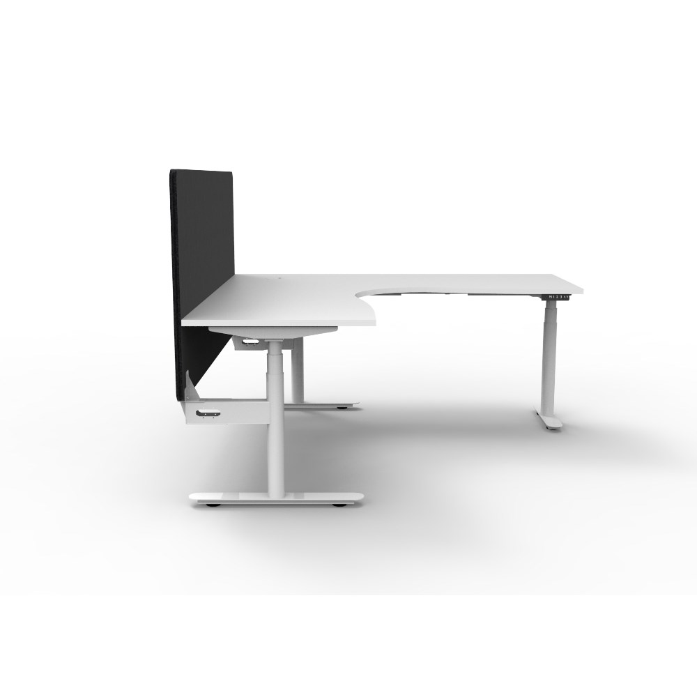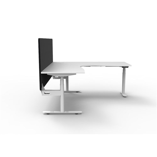 • Electric height adjustable corner workstation with White top and White Satin frame, Black Eco screen.