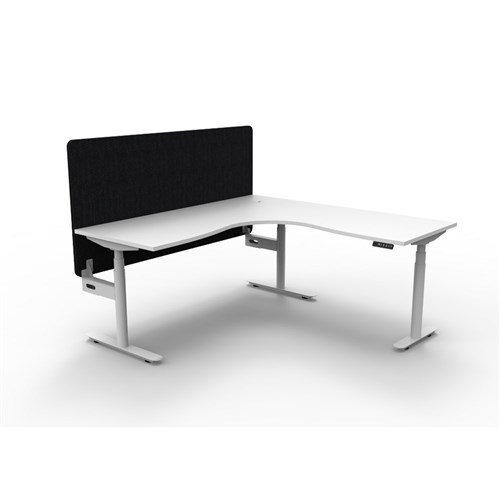 • Electric height adjustable corner workstation with White top and White Satin frame, Black Eco screen.