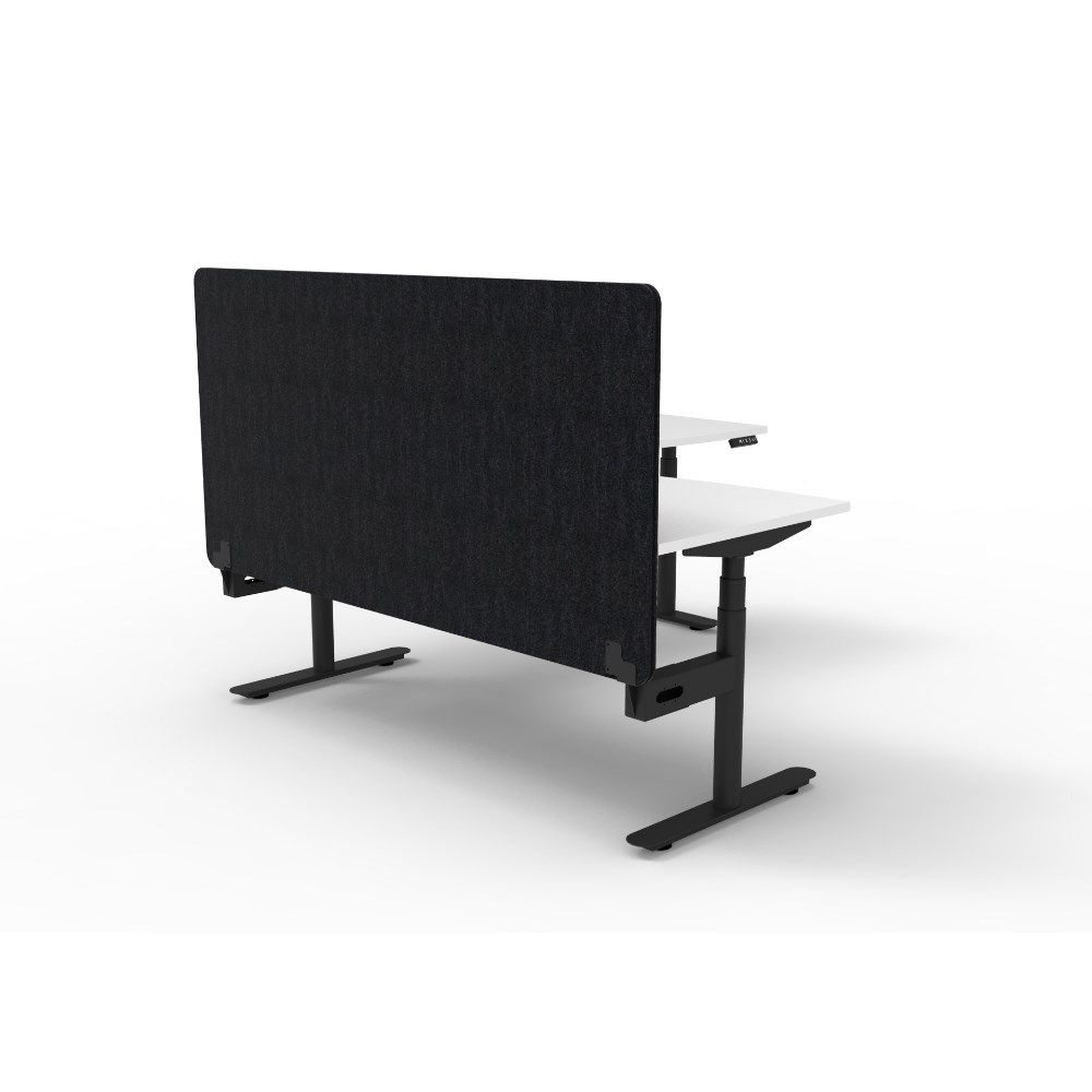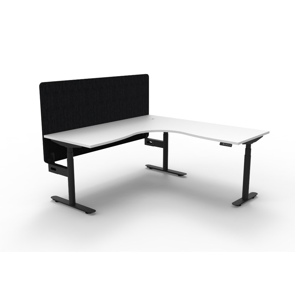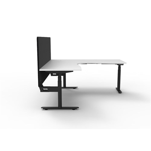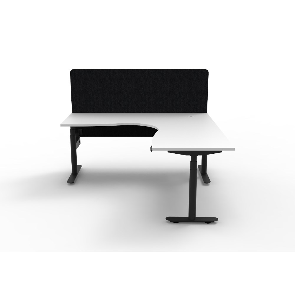 • Electric height adjustable corner workstation with White top and Black Satin frame, Black Eco screen.
