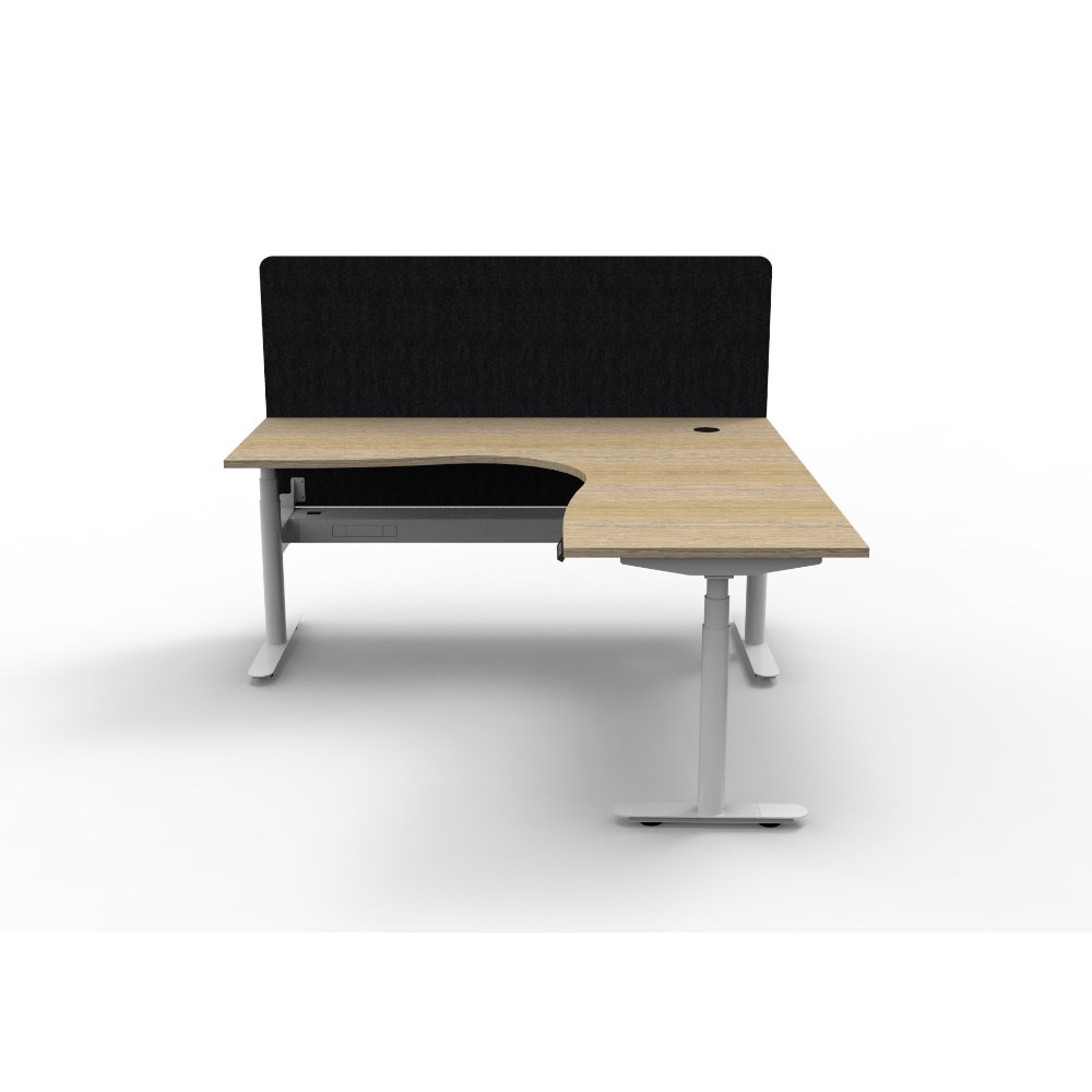 • Electric height adjustable corner workstation with Natural Oak top and White Satin frame, Black Eco screen and cable tray.
