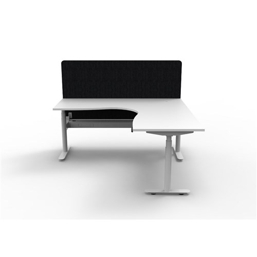• Electric height adjustable corner workstation with Natural White top and White Satin frame, Black Eco screen and cable tray.