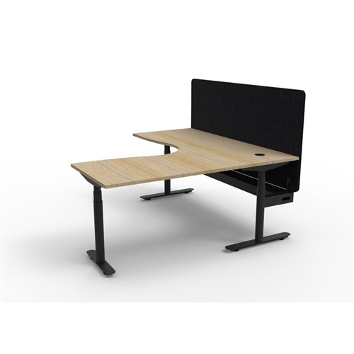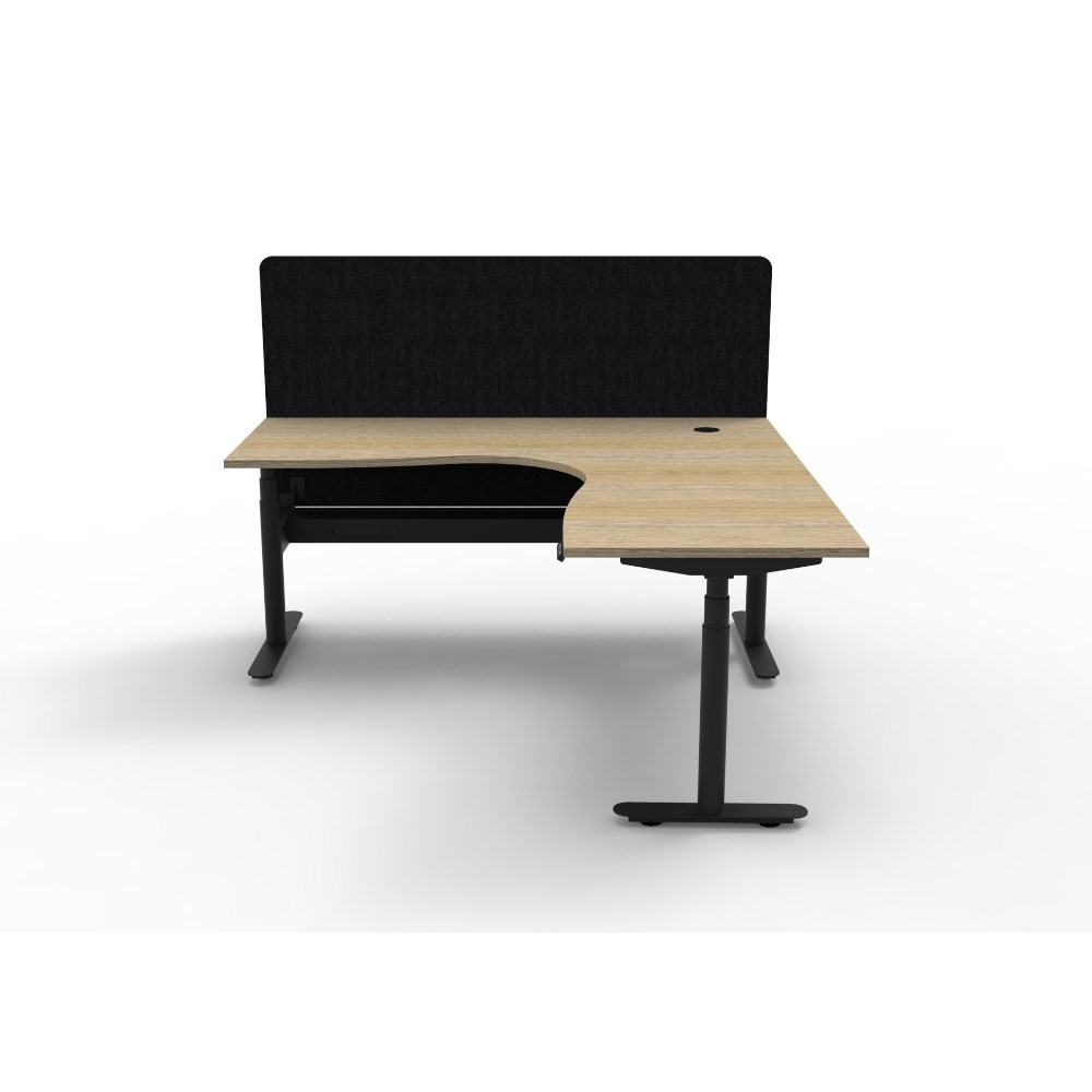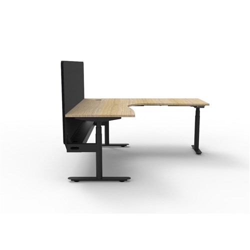 • Electric height adjustable corner workstation with Natural Oak top and Black Satin frame, Black Eco screen and cable tray.