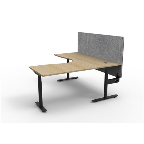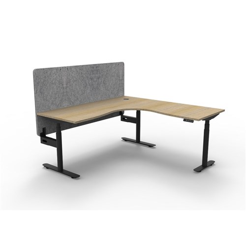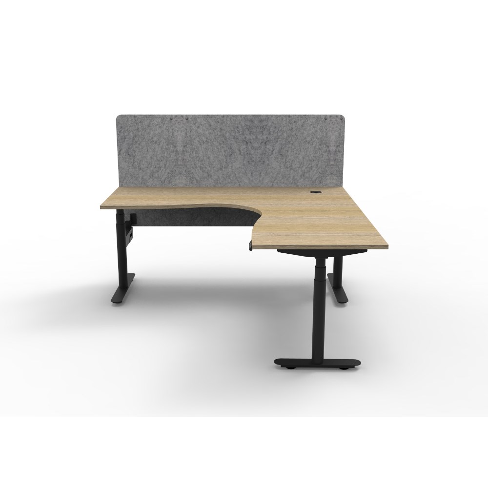 • Electric height adjustable corner workstation with Natural Oak top and Black Satin frame, Grey Eco screen.