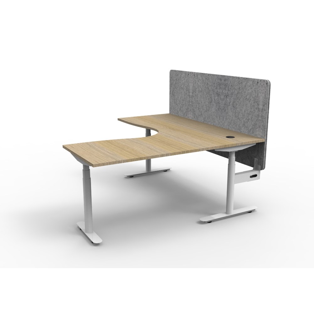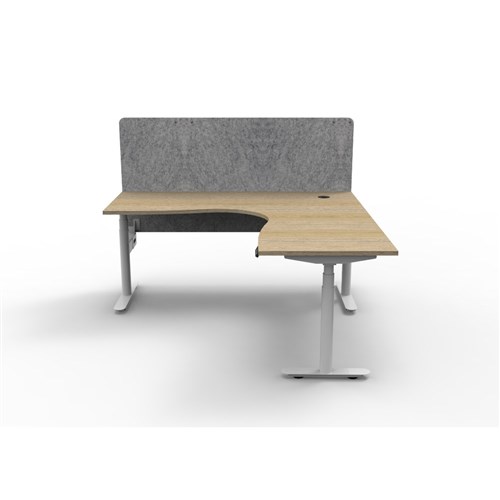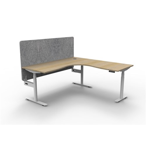 • Electric height adjustable corner workstation with Natural Oak top and White Satin frame, Grey Eco screen.