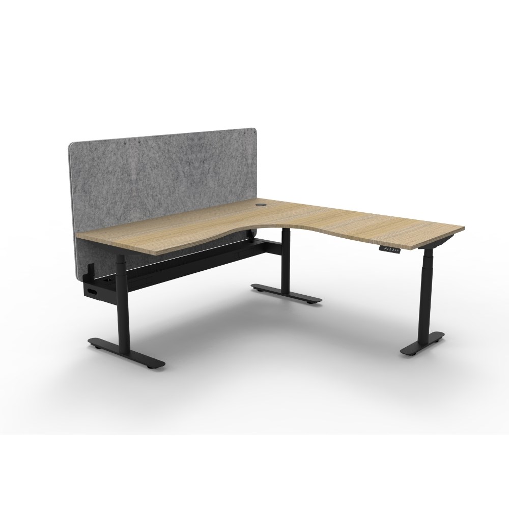 • Electric height adjustable corner workstation with Natural Oak top and Black Satin frame, Grey Eco screen and cable tray.