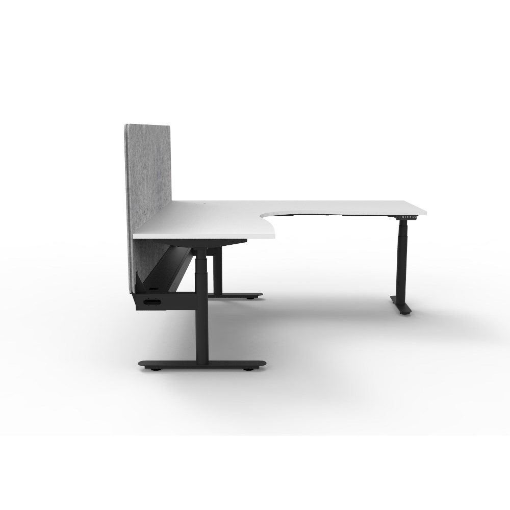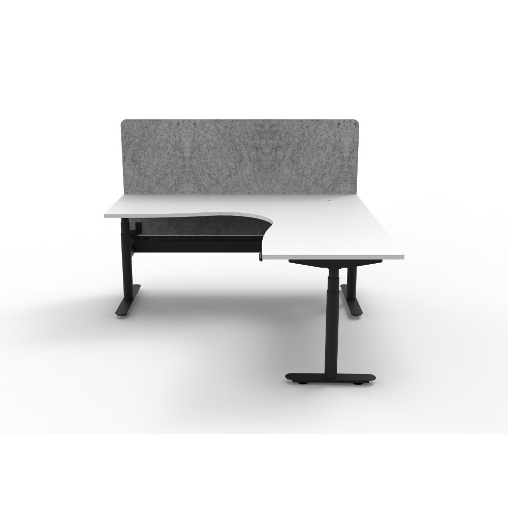 • Electric height adjustable corner workstation with Natural White top and Black Satin frame, Grey Eco screen and cable tray.