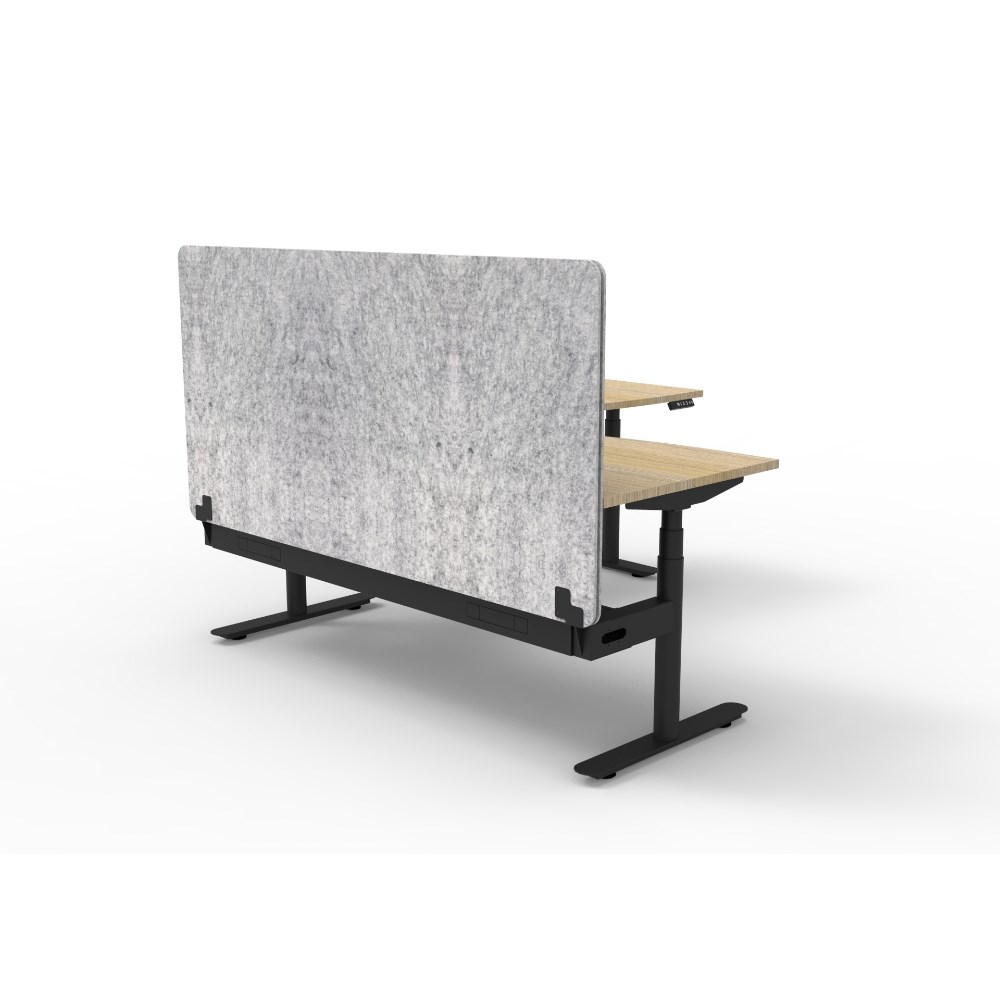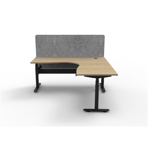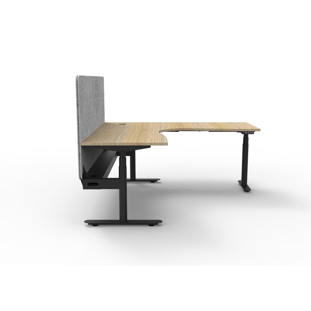 • Electric height adjustable corner workstation with Natural Oak top and Black Satin frame, Grey Eco screen and cable tray.