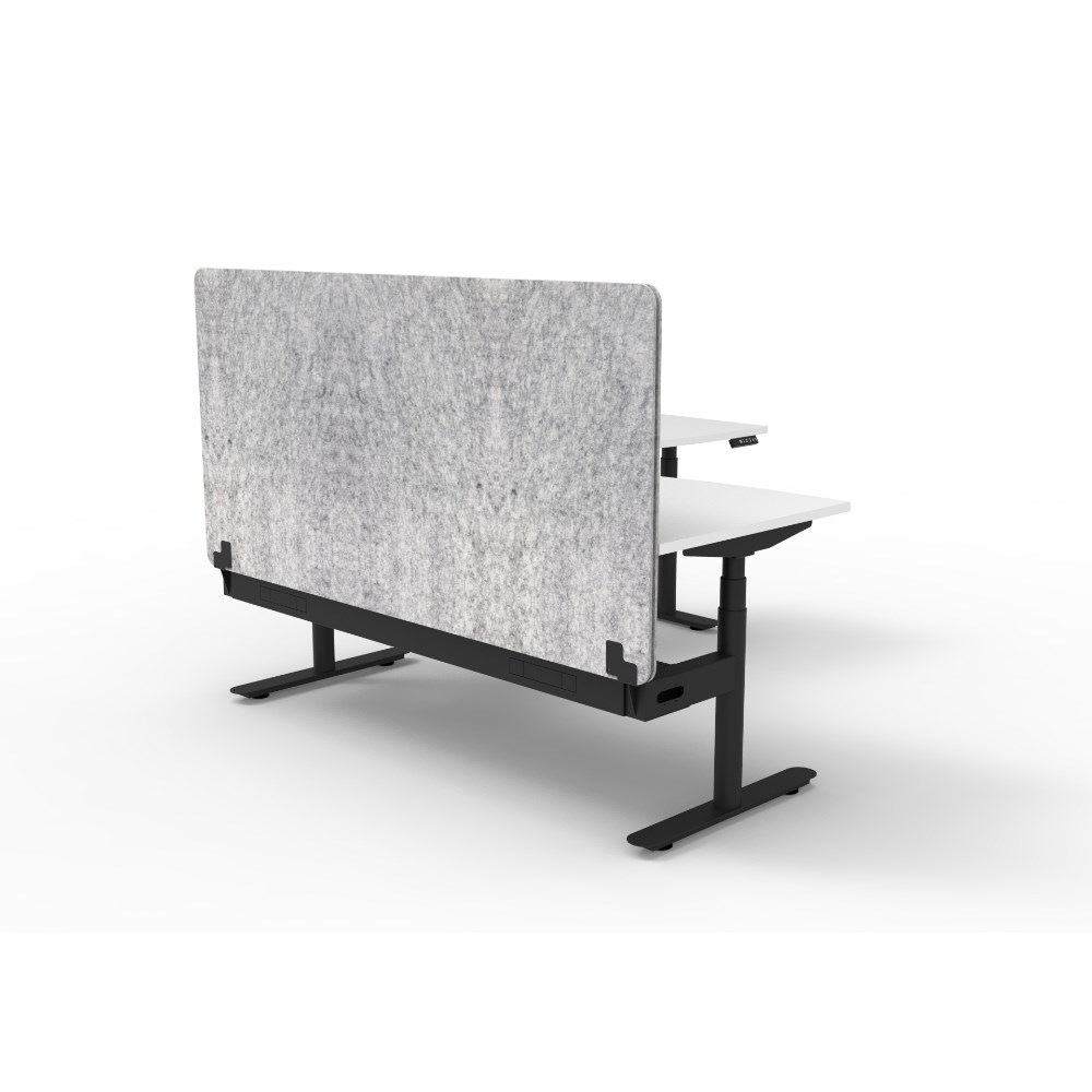 • Electric height adjustable corner workstation with Natural White top and Black Satin frame, Grey Eco screen and cable tray.