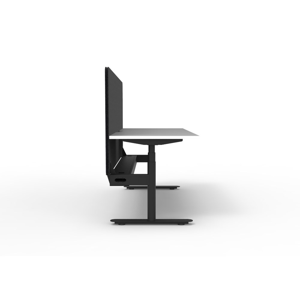 • Natural White worksurface with rigid edging and 50mm scallop cable cut out. E0 rated 25mm top. Black Satin powder coat round-leg frame. Eco screen and cable tray.