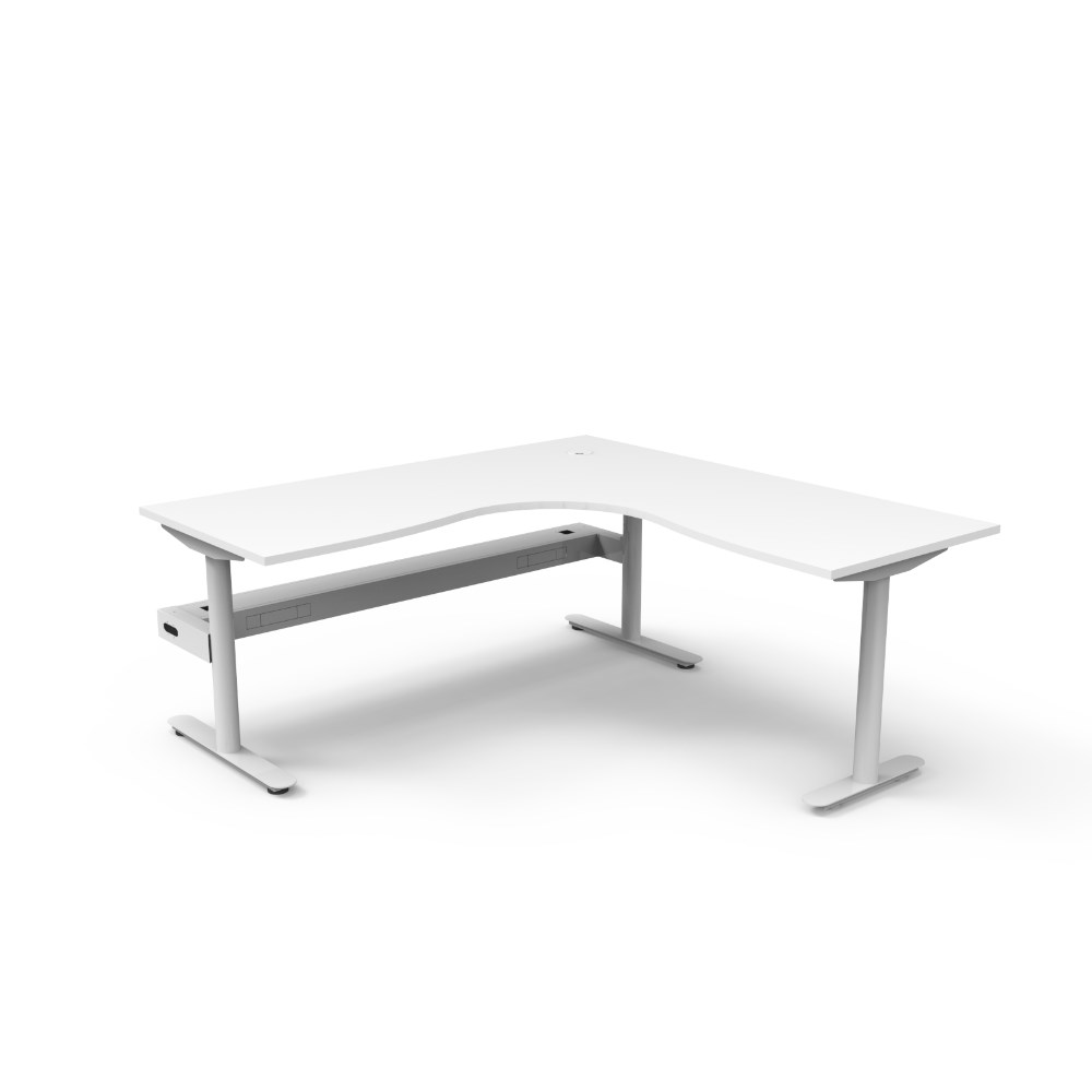 • Natural White top White Satin frame. Corner workstation with cable tray.